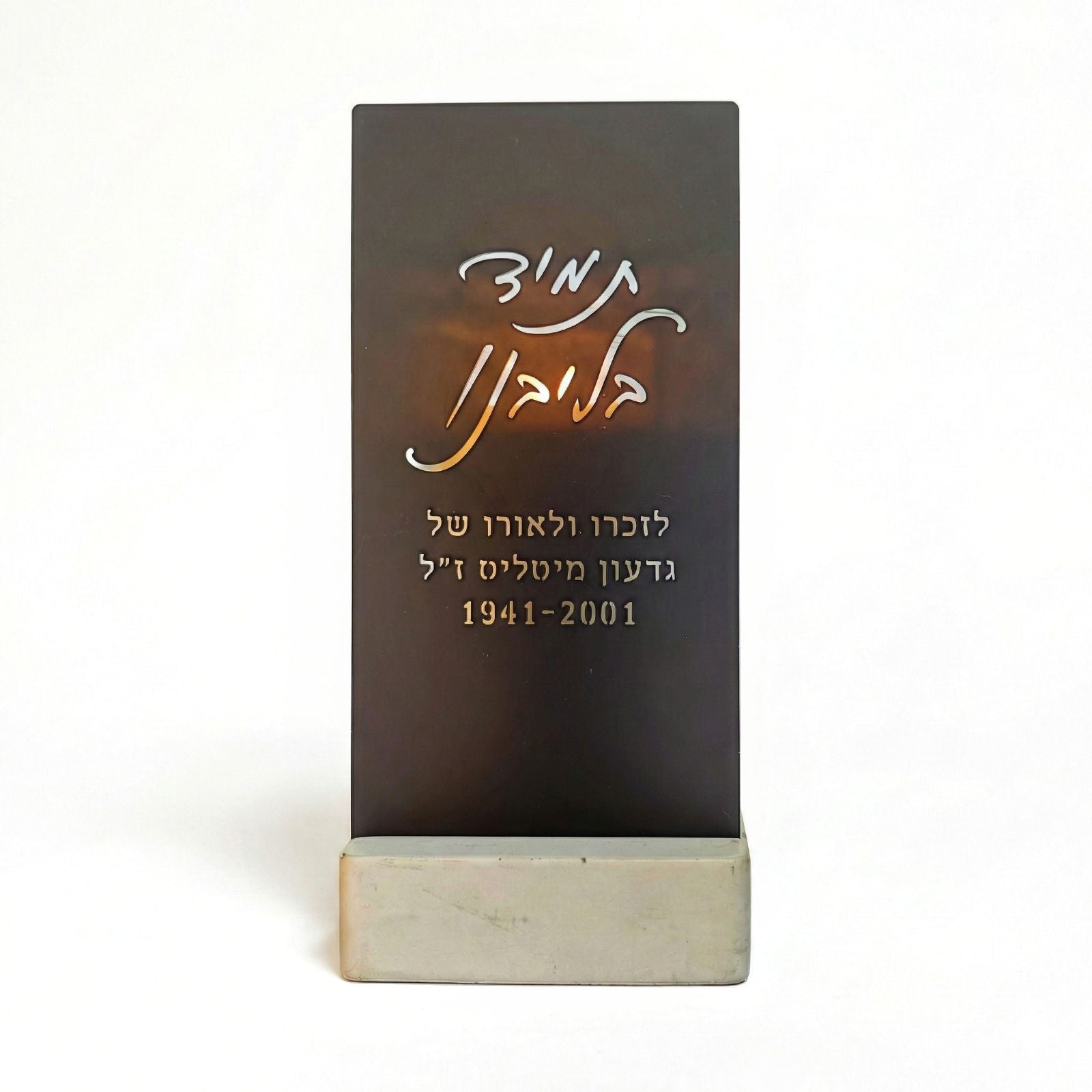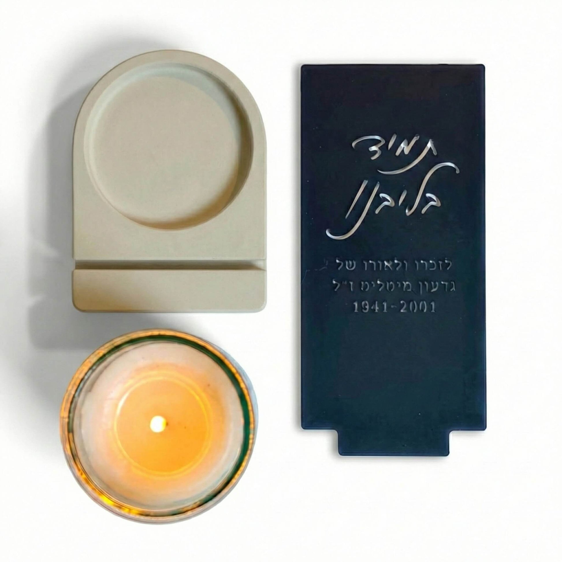 מעמד לנר נשמה רב יומי. תחתית יצוקה בבטון בשילוב פלטת פרספקס עם כיתוב בחיתוך לייזר.